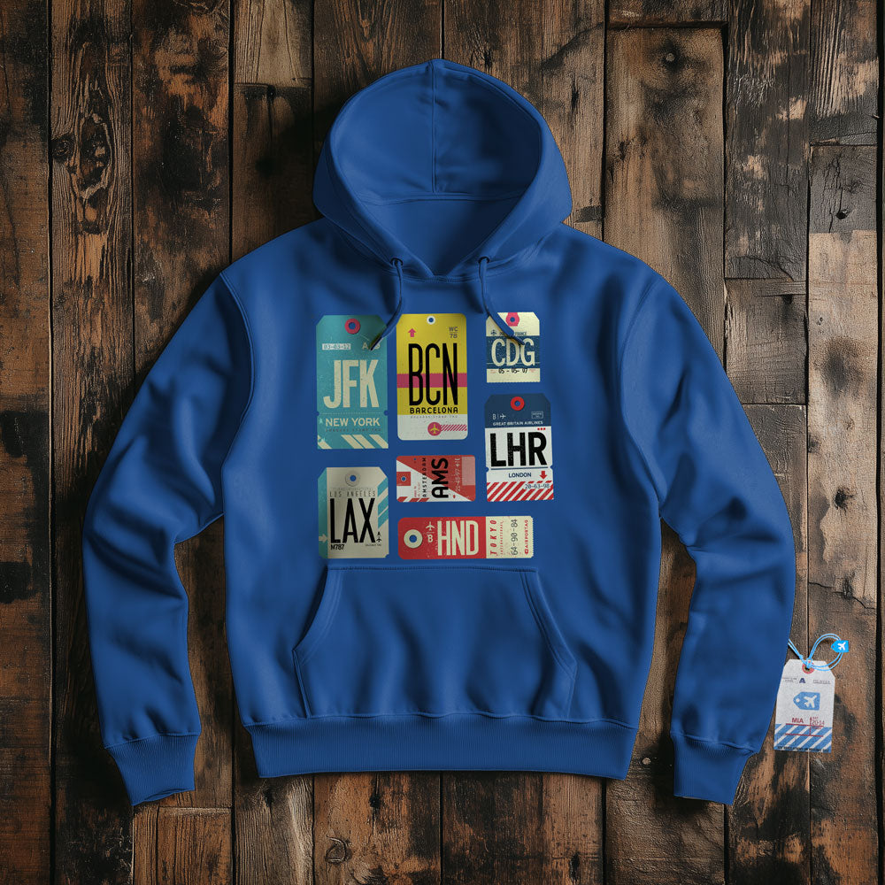 Airportag’s signature aviation-themed designs will showcase your love for all things flight-related. From vintage baggage tag-inspired prints to airport code graphics, our hoodies are a unique way to express your wanderlust.